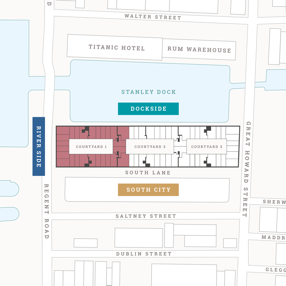Tobacco Warehouse offers three main views. All apartments are dual aspect, with views to an inner courtyard and externally to either Stanley Dock, the River Mersey, South Lane or city centre skyline.